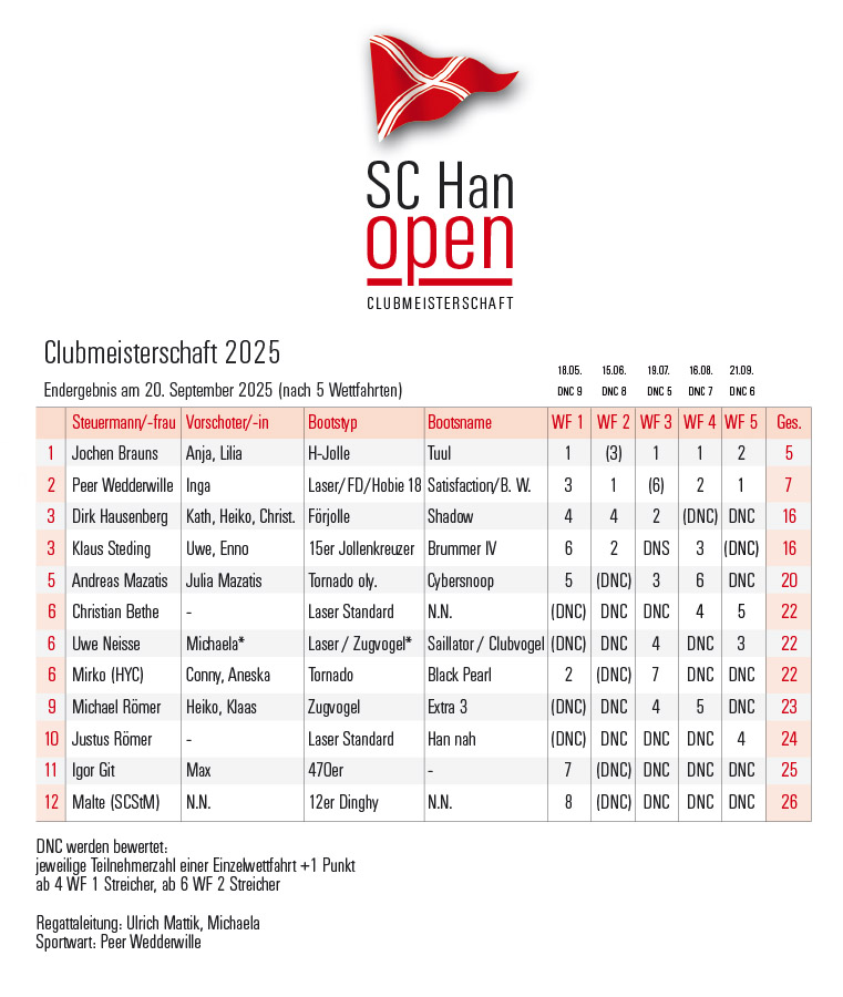25. Februar 2026: Nach den vielleicht turbulentesten Wochen in der Clubgeschichte (mehr dazu später) können wir nun die Ergebnisse der Clubmeisterschaft aus dem letzten Jahr zeigen. Wir gratulieren Jochen Brauns und seinen Vorschoterinnen Anja und Lilia ganz herzlich zum Titel „SC Han Clubmeister 2025“.